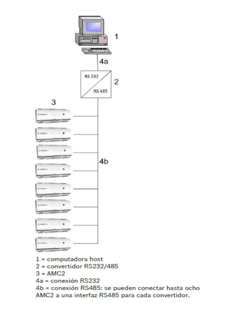 Estos est&aacuten conectados al sistema host mediante RS485, RS232 (por ejemplo, funcionamiento con m&oacutedem) o Ethernet, seg&uacuten el tama&ntildeo del sistema. La interfaz de host pertinente se selecciona durante la instalaci&oacuten. Las tres interfaces se encuentran disponibles en el dispositivo de forma predeterminada. El funcionamiento de RS485 permite conectar un m&aacuteximo de ocho AMC2 a una l&iacutenea.