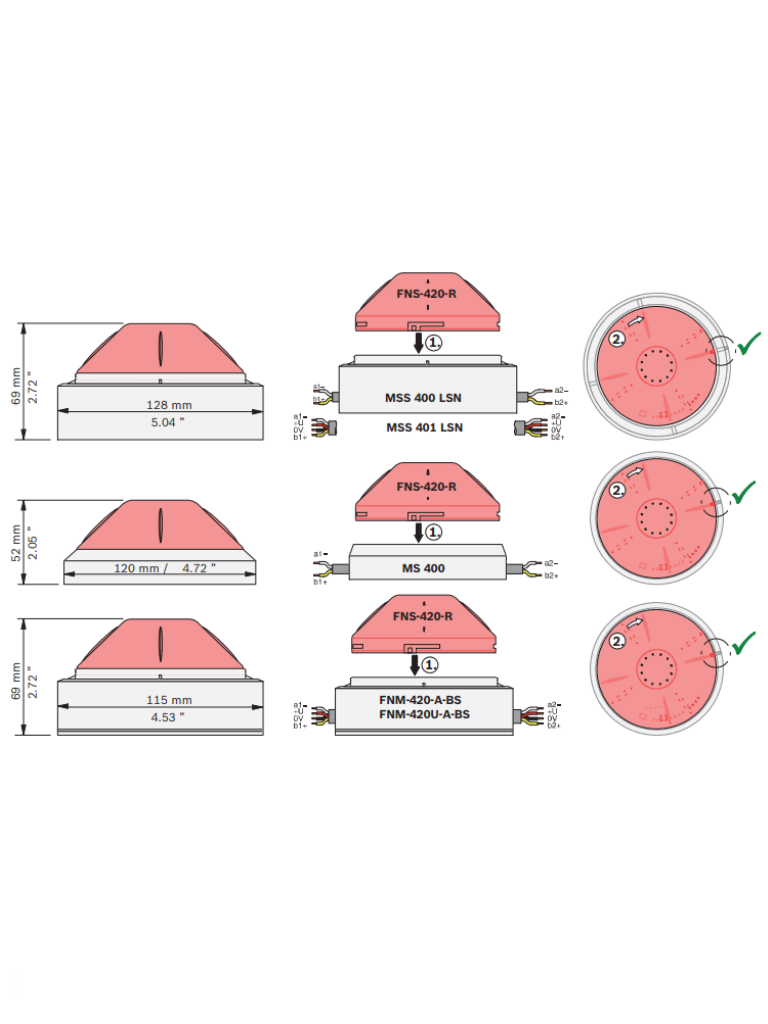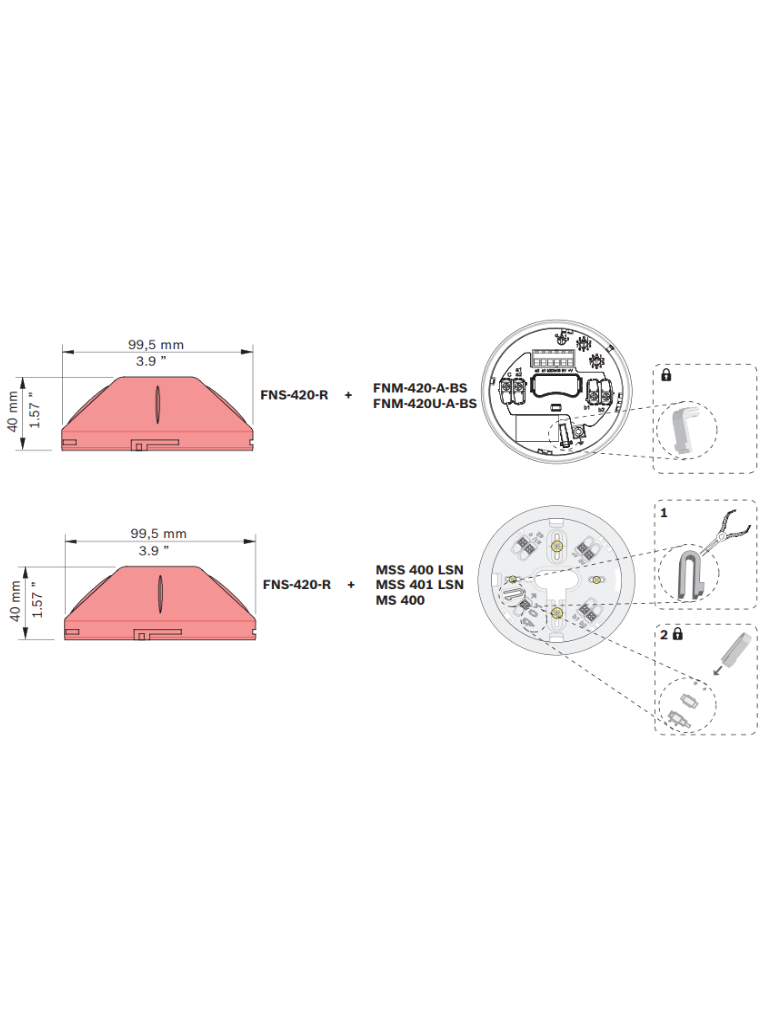 La luz estroboscópica LSN se puede utilizar con las sirenas de base FNM-420-A-BS / FNM-420U-A-BS o las bases de detector con sirena LSN MSS 400 / MSS 401, lo que proporciona una señalización visual y acústica combinada. Montada en la base de detector MS 400, el FNS-420-R puede usarse como luz estroboscópica sin señalización acústica. Ambas aplicaciones se integran fácilmente en una red de seguridad local (LSN) existente.