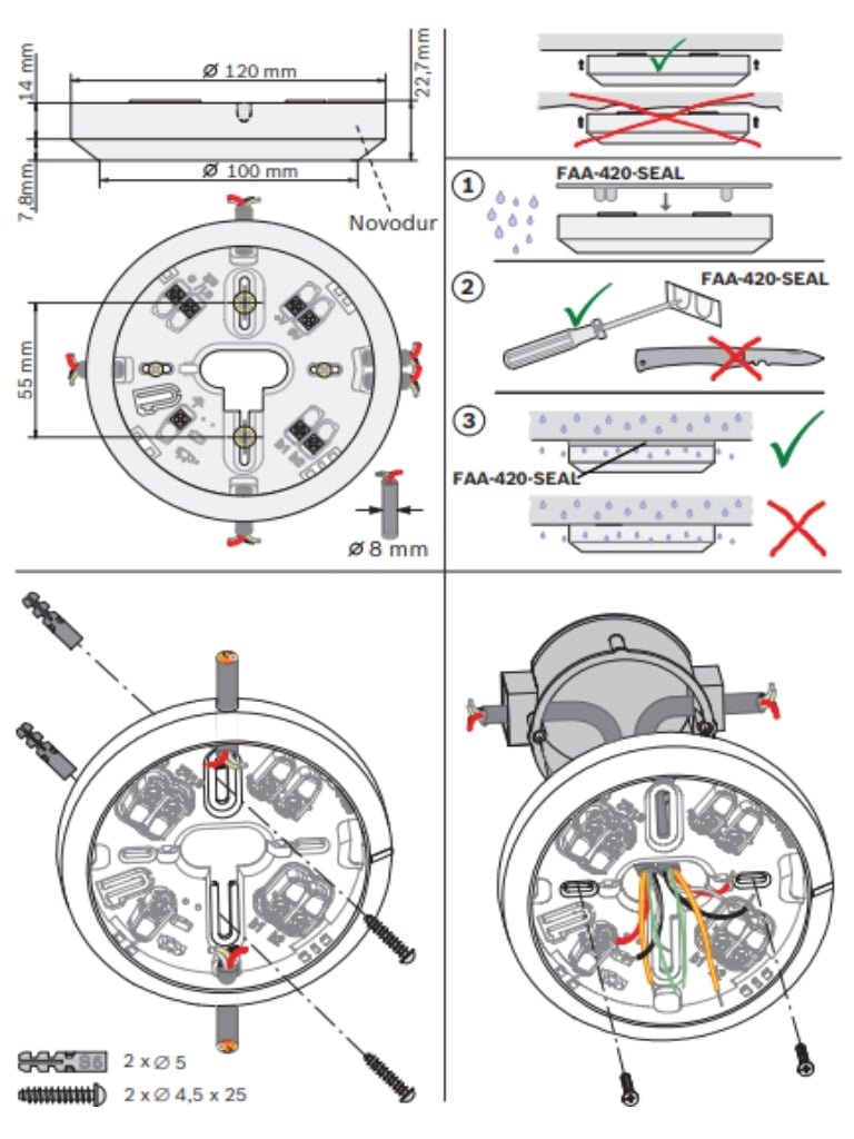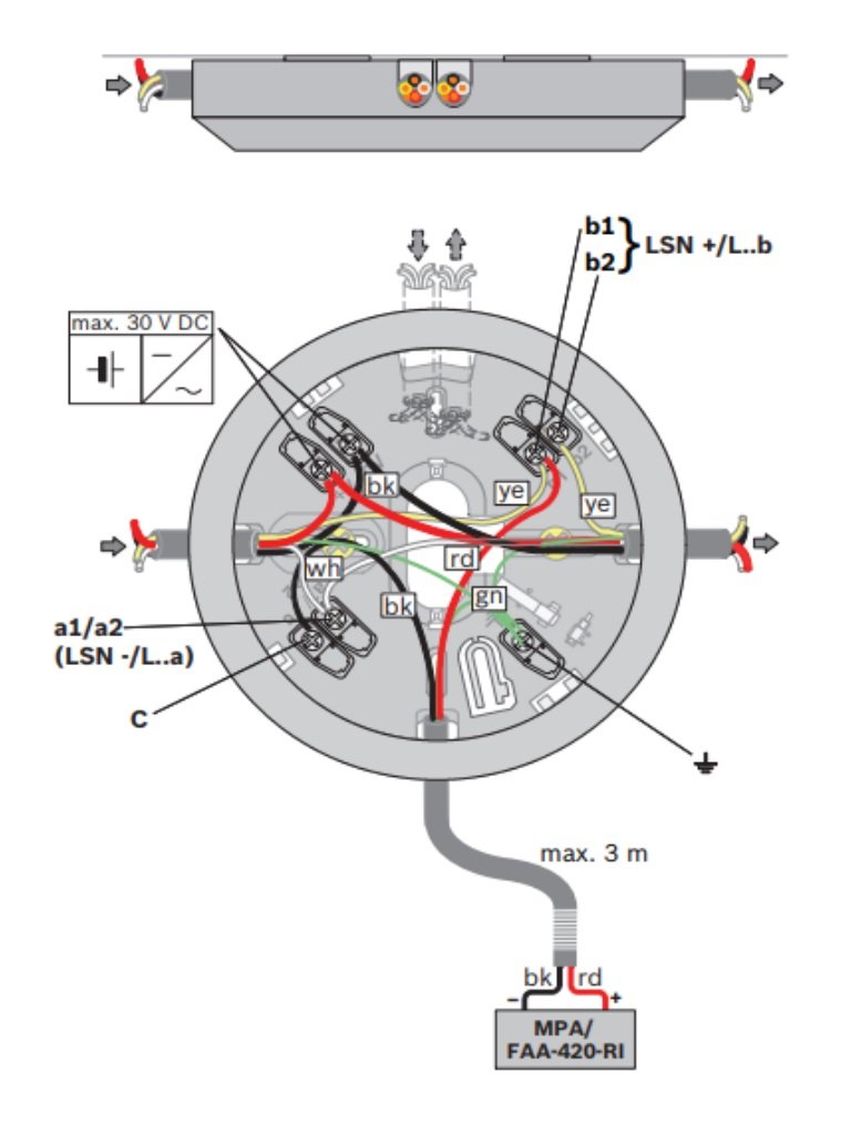 El cabezal del detector se instala en la base de detector MS 400. La base es apta para cableado de superficie y empotrado y cuenta con puntos de conexión diferentes para cajas de montaje en el techo o empotradas. Además, se adapta a todas las herramientas estándar de perforación. La base de detector, hecha de plástico ABS (Novodur, color parecido a RAL 9010) tiene un acabado mate y siete bornes para conectar el detector y sus accesorios a la central de incendios. Los contactos conectados a las terminales garantizan una conexión eléctrica segura al instalar el módulo detector. Se pueden utilizar cables de hasta 2,5 mm2 de diámetro. Para evitar extracciones no autorizadas, la cabeza del detector se puede asegurar con un bloqueo variable.