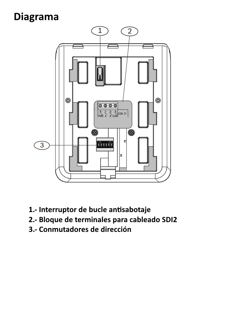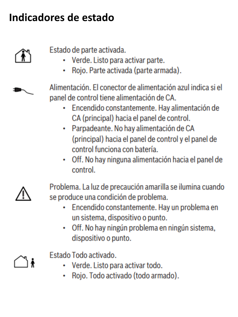 - Indicadores de estado armado/listo para armar/ total/parcial, problema y alimentación.