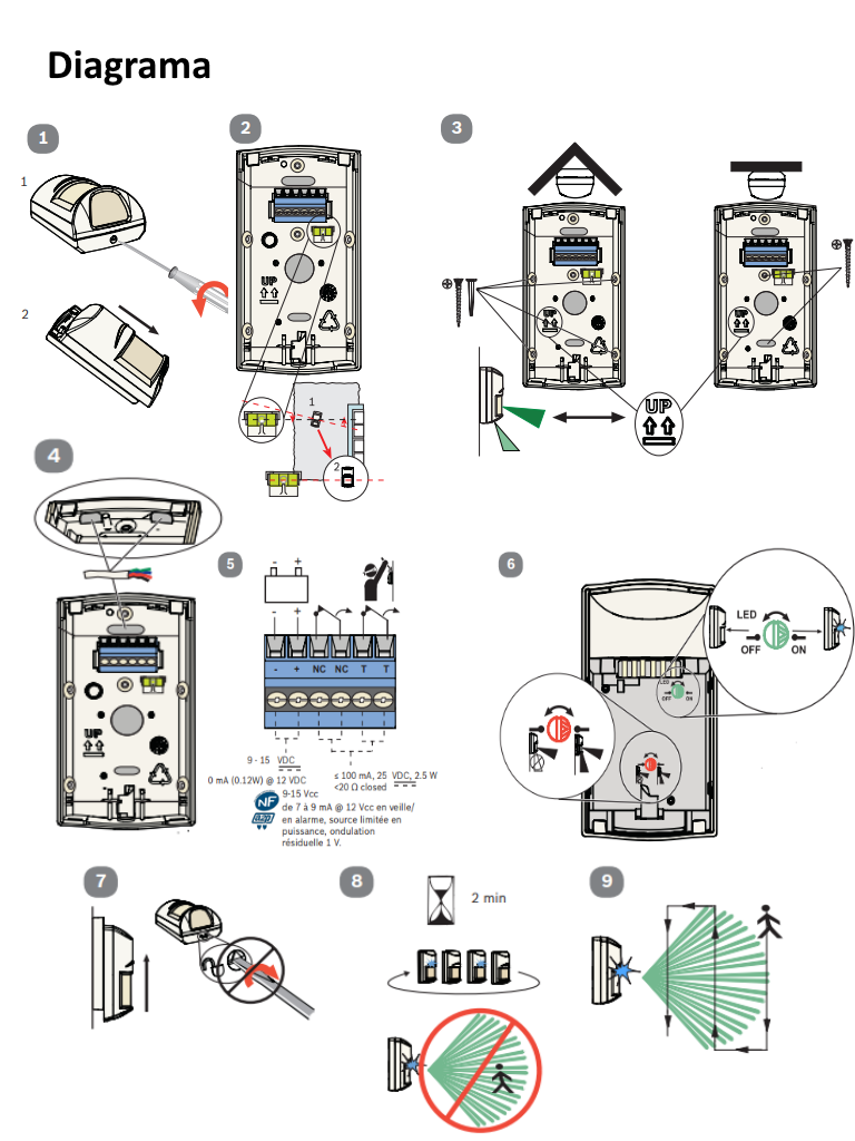 - Sabotaje: Contactos normalmente cerrados (NC) (con la cubierta colocada) preparados para ≤100 mA, 25 VCC, 2,5 W.