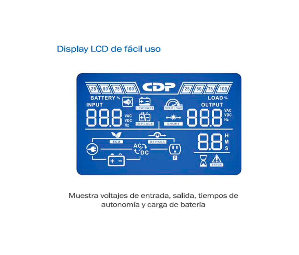 130%: Modo batería: el UPS se apaga de inmediato / modo normal: el UPS transfiere a modo bypass cuando la electricidad es normal