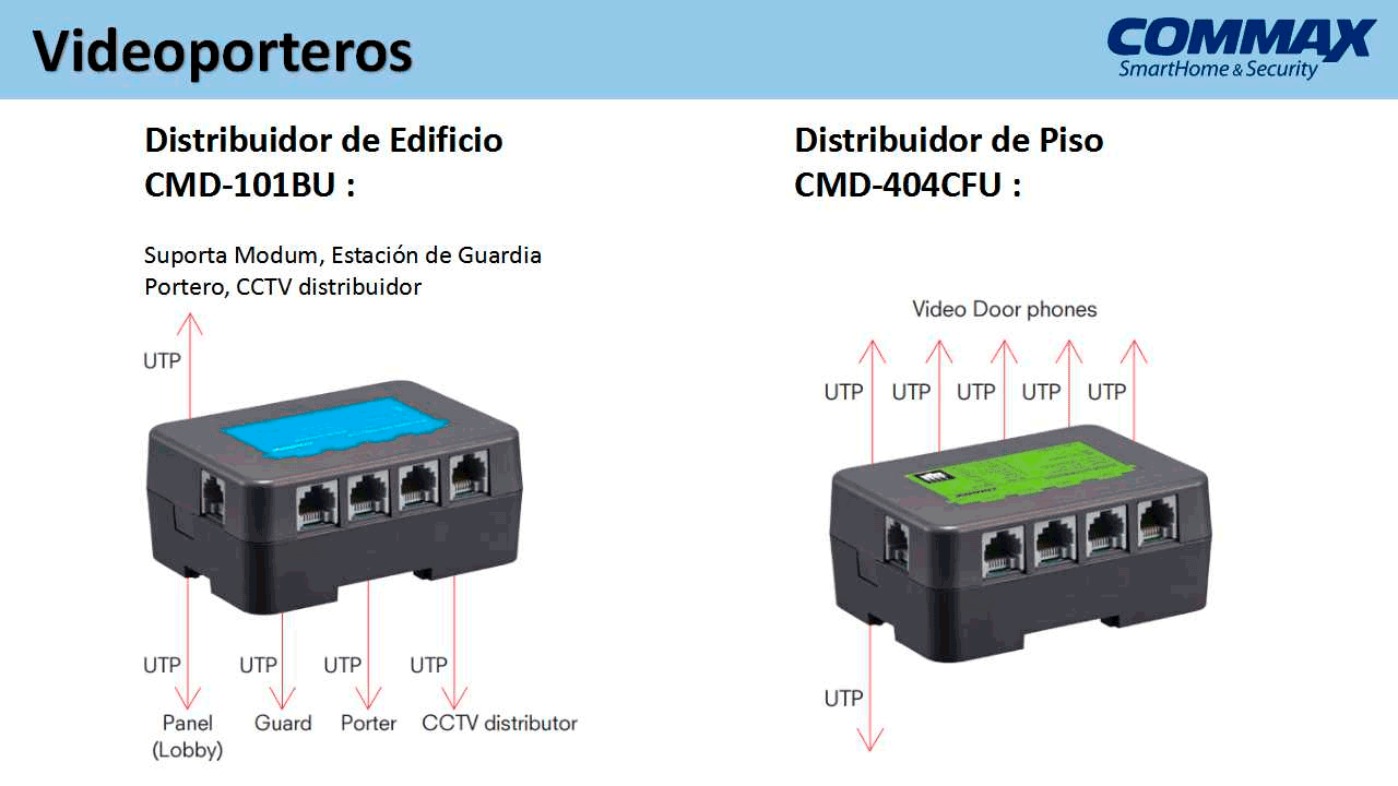 Distribuidor de edificios de Commax modelo CMD-101BU, sin limitación en el cableado todo UTP. Conexión de distribuidores modulares con cámaras CCTV y monitores FINE VIEW Brinda diversas opciones en sistemas de audio y video.