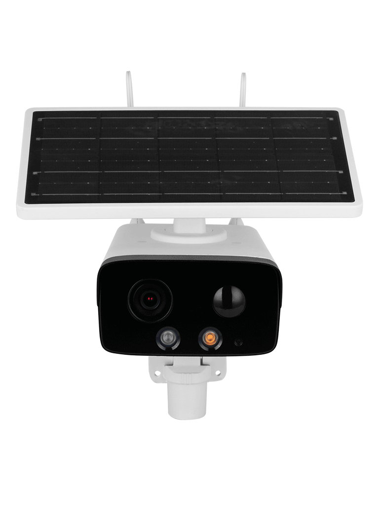 DAHUA DH-IPC-HFW2431DG-4G-SP-LA-B Cámara IP bullet 4G con panel solar y batería, resolución 4MP. Disuasión activa, IR hasta 50 m, luz cálida 30 m. Incluye ranura para Micro SD, audio bidireccional, Starlight, H.265, IP67.