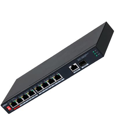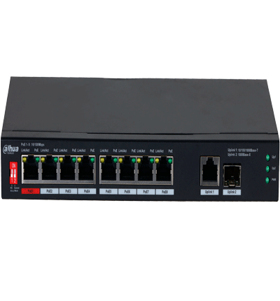 DAHUA PFS3110-8ET1GT1GF-96 -Switch PoE de 10 Puertos/8 Puertos Poe 10/100/1Puerto SFP de1000 Mbps/1 Puerto Uplink de 10/100/1000/ 96 Watts Totales/ Alimentación hasta 250 Mts/Soporta PoE Whatchdog/Puerto Rojo soporta IEEE 802.3bt/