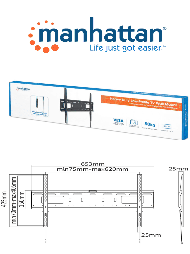 MANHATTAN 461986 – Soporte para monitor con montaje en pared / Pantallas de 37″ a 70″ / Soporta hasta 50 Kg / Diseño ultra delgado / Color Negro / VESA / Instalación Fija (Sobre Pedido)