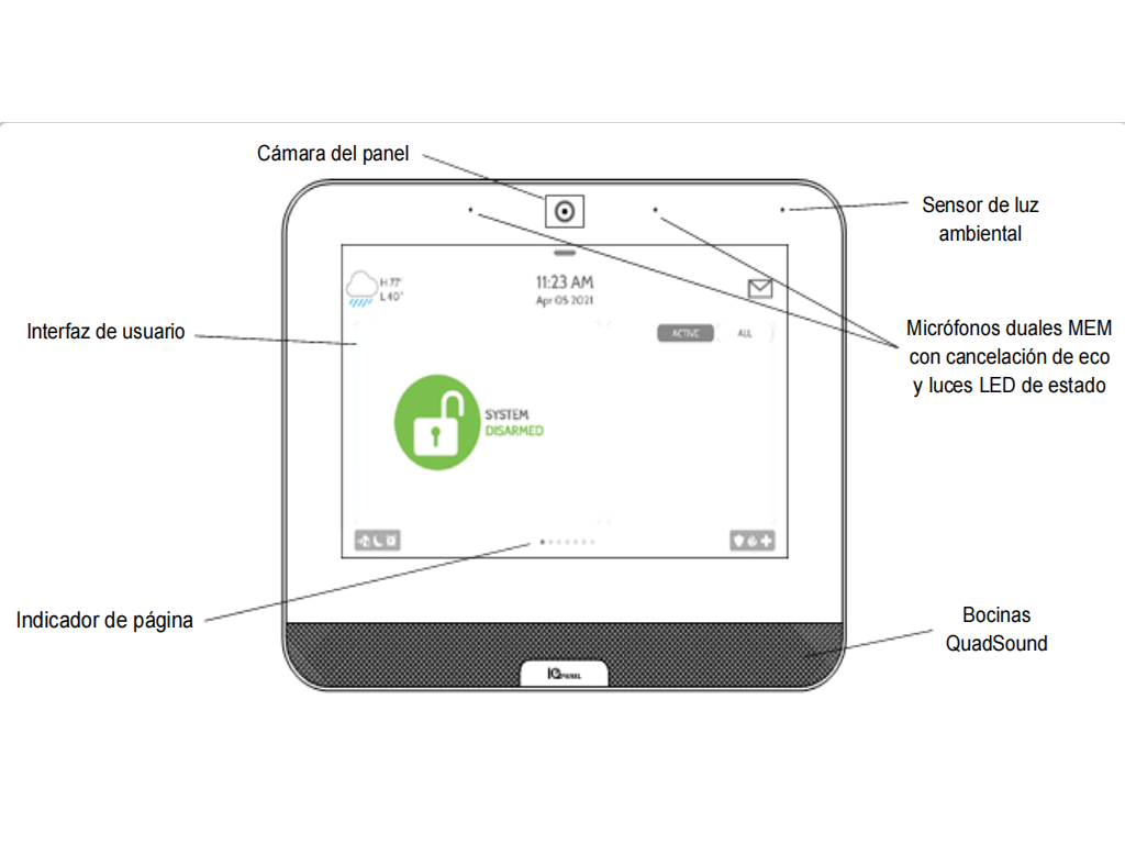 El IQ Panel 4 incluye un comunicador AT&t LTE y una tarjeta WIFI de doble banda. Por seguridad, se admiten los sensores PowerG de 915 MHz y 319.5 Mhz Tiene una elegante pantalla táctil HD All-In-One de vidrio capacitivo de 7" y admite 128 zonas y 242 usuarios.