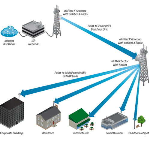 La forma compacta de las antenas airFiberX permite ser utilizadas en diversas aplicaciones, como enlaces para Backhaul entre torres para así poder realizar sus enlaces punto a punto.