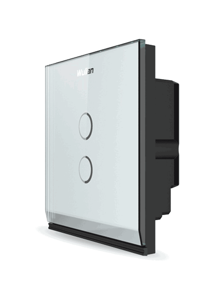 El modelo SWITCHT2LN es un apagador inteligente touch elaborado en cristal templado, que cumple con la función de un apagador convencional con la diferencia de poder ser controlado desde la app de WULIAN Smart Home en dispositivos iOS y Android. Su tipo de conexión es L&N (Requiere de neutro).
